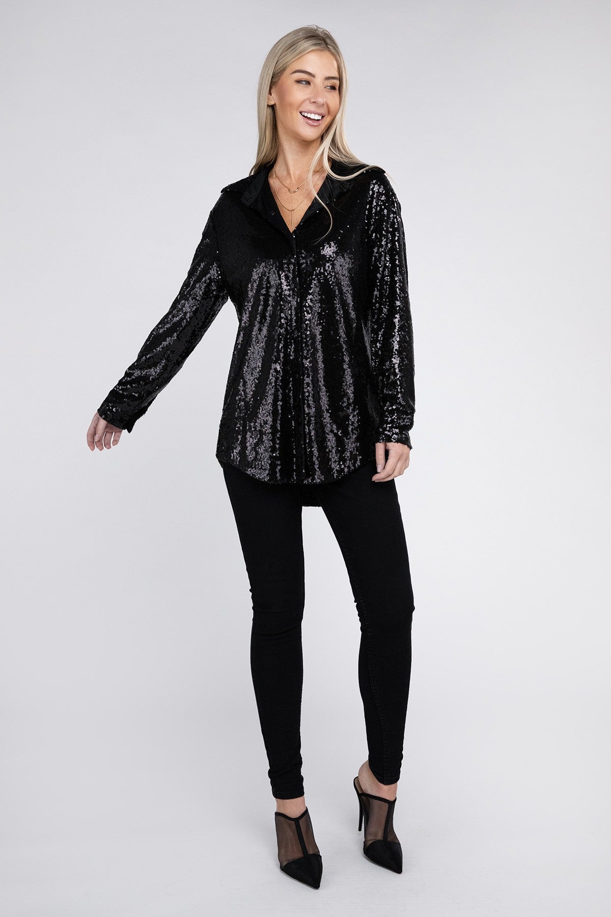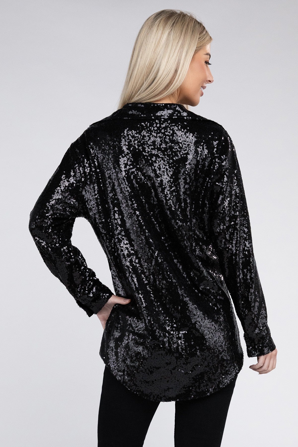 Our Sequin Collared Button Up Shirt is all around sequin!